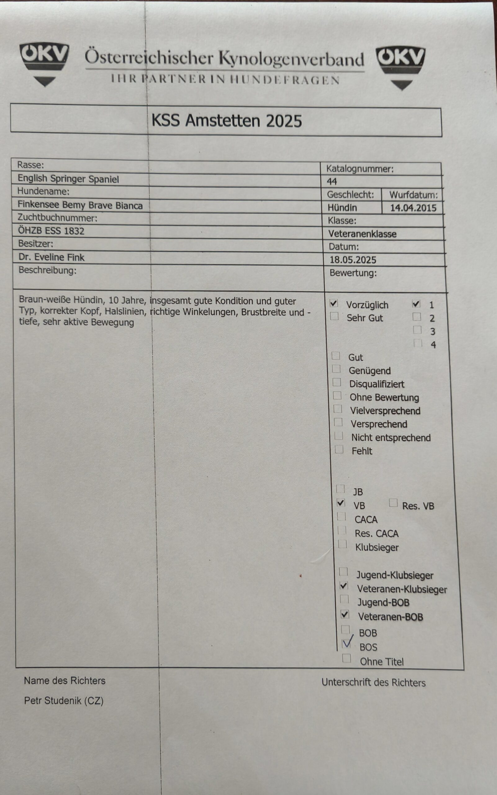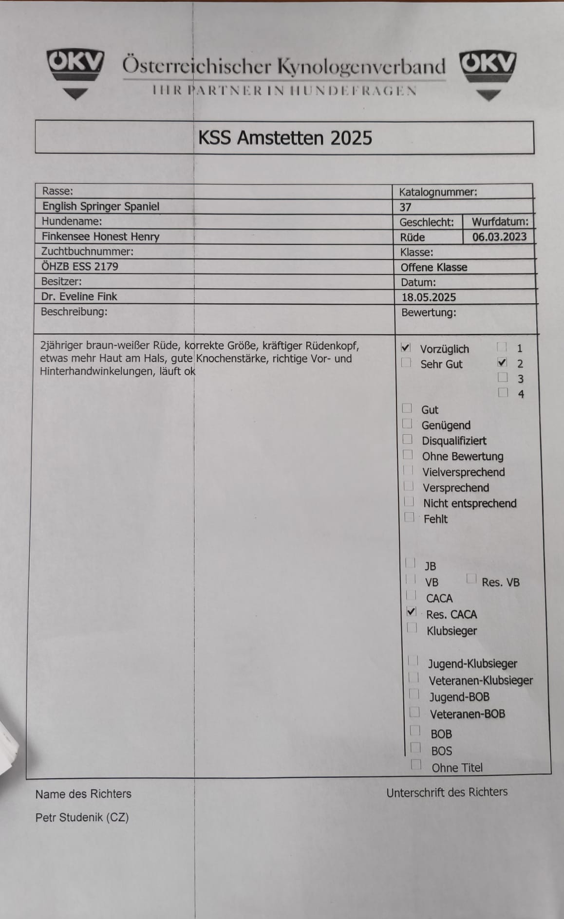 Trotz windigem und regnerischem Wetter fand die Klubsiegerschau 2025 auf dem Hundesportplatz des HRV Amstetten erfolgreich statt. Unsere beiden Springer, Finkensee’s Honest Henry und Finkensee’s Bemy Brave Bianca, ließen sich vom Wetter nicht beeindrucken und präsentierten sich hervorragend im Ausstellungsring.